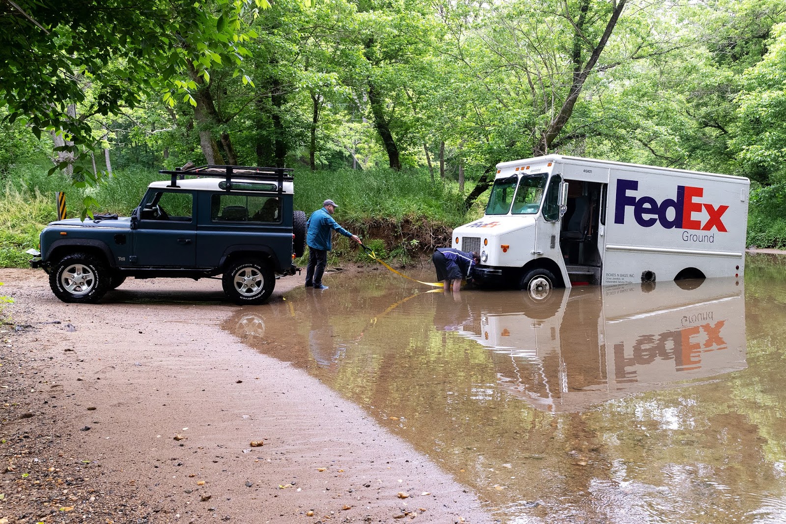 I made my way back across Butchers Branch, and we began assessing what our options would be for pulling the FedEx truck out of its predicament.